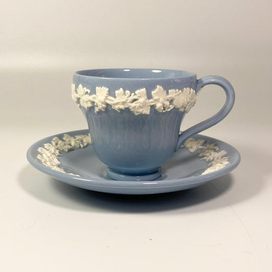1950s WEDGWOOD QUEENSWARE Blue on Cream Footed Demitasse small Cup & Saucer