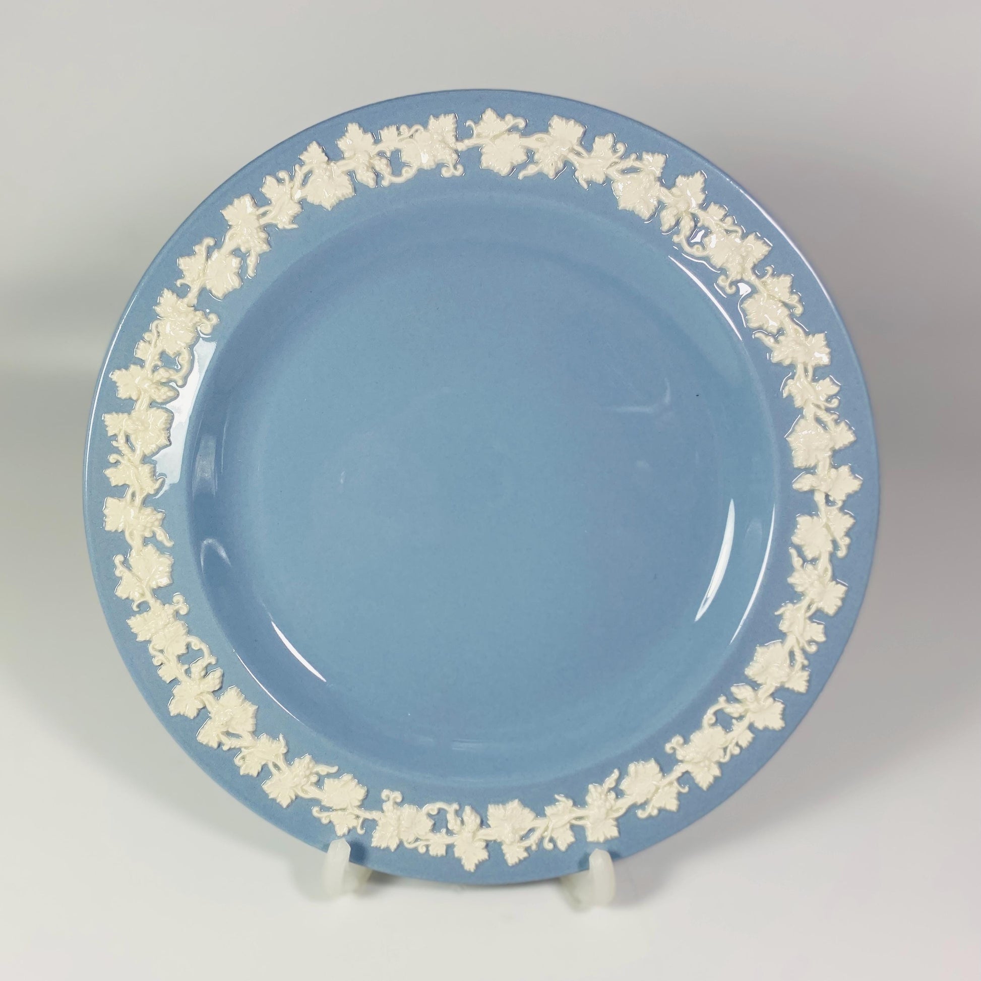 This vintage 1950s Wedgwood Etruria and Barlaston bread plate is a 7-inch round porcelain piece in a classic blue color. It features an embossed Queensware pattern, showcasing intricate details that add a touch of elegance to the design. Handmade in England with a glossy finish, this bread plate is part of the Queensware product line by Wedgwood, known for its high-quality pottery production techniques. The backstamp is printed on the plate, indicating its originality and authenticity. Ideal for collectors or those looking to add a vintage touch to their tableware collection.