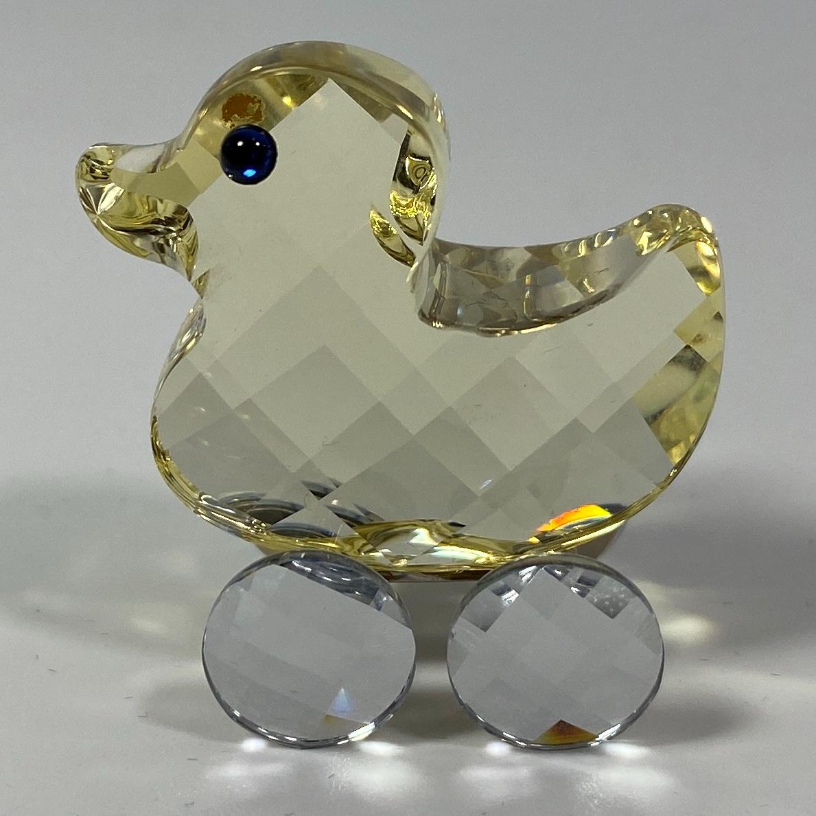 This rare Swarovski crystal figurine features Lucy the Duck, rolling on wheels and adorned with yellow crystals. The intricate details and vibrant colors make this a must-have for collectors of animal-themed decorative collectibles. Made from high-quality crystal material, this figurine is a unique addition to any sculpture collection. The Swarovski brand is known for its exceptional quality and attention to detail, making this piece a true gem. Don't miss out on the opportunity to add this retired Lucy the Duck figurine to your collection