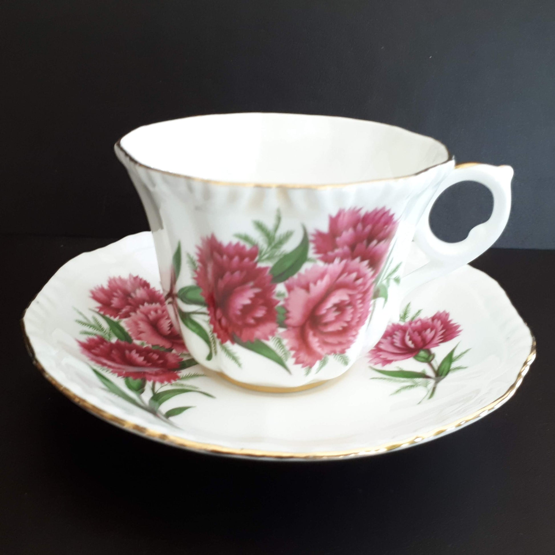 Royal Grafton Bone China with large deep pink Carnation flowers teacup & saucer
