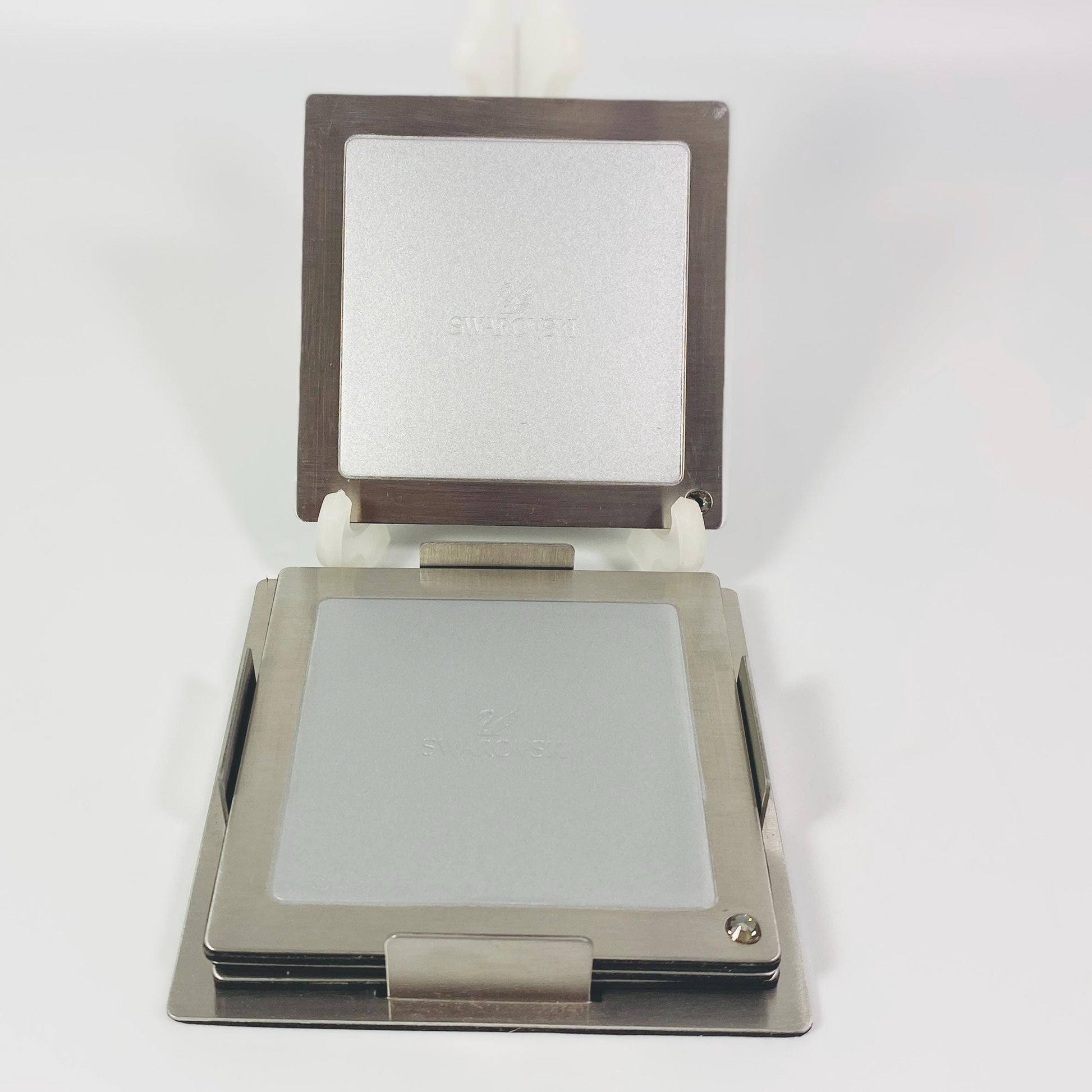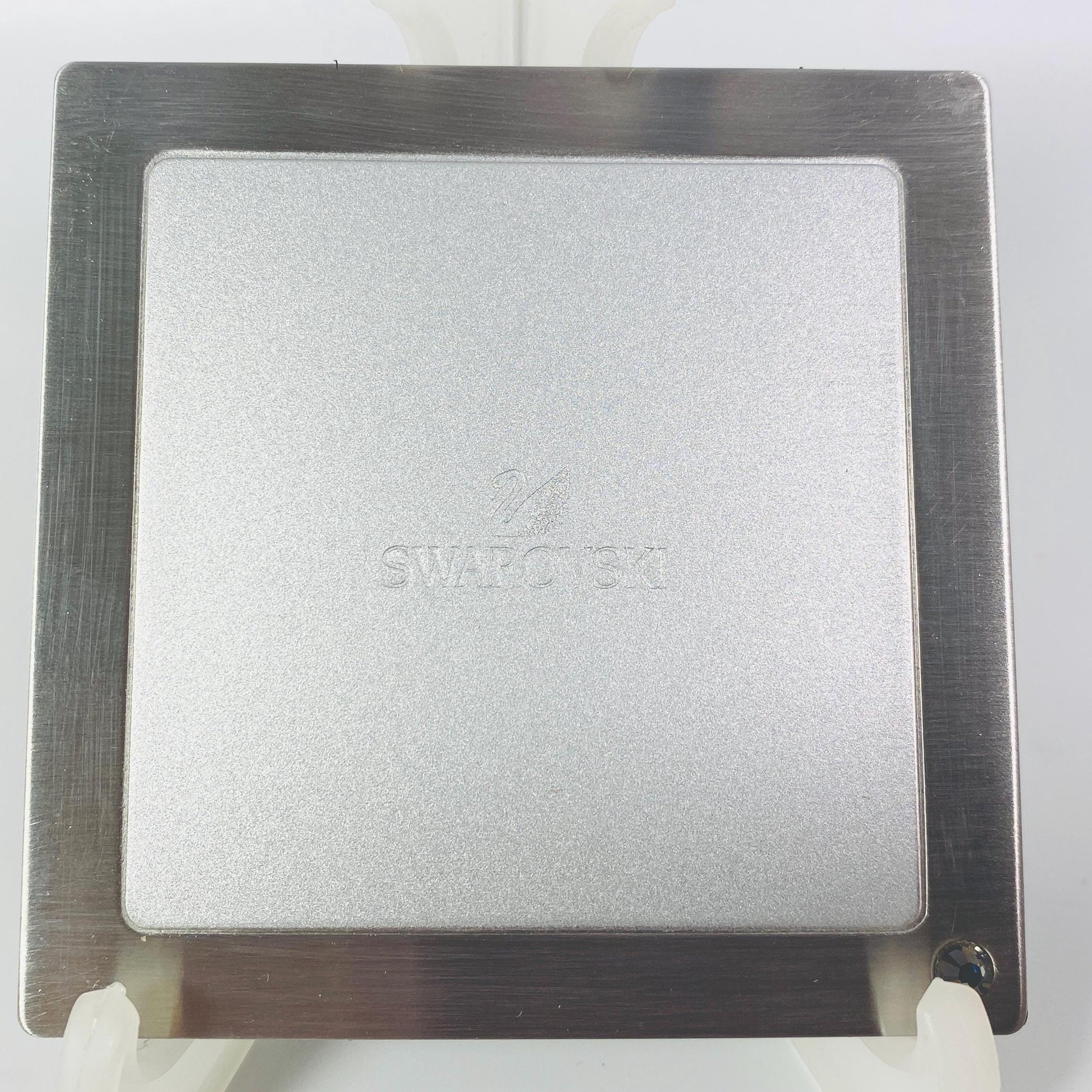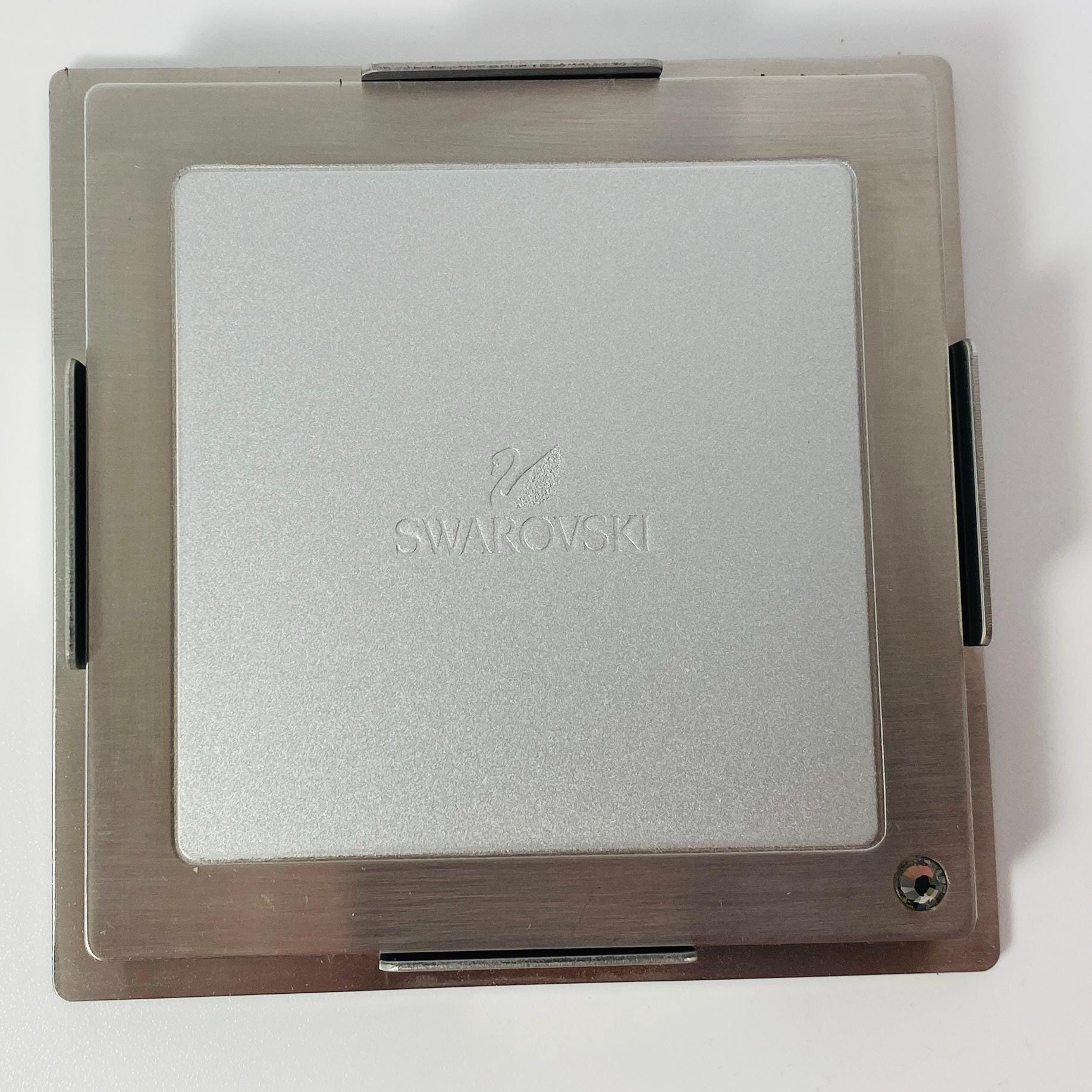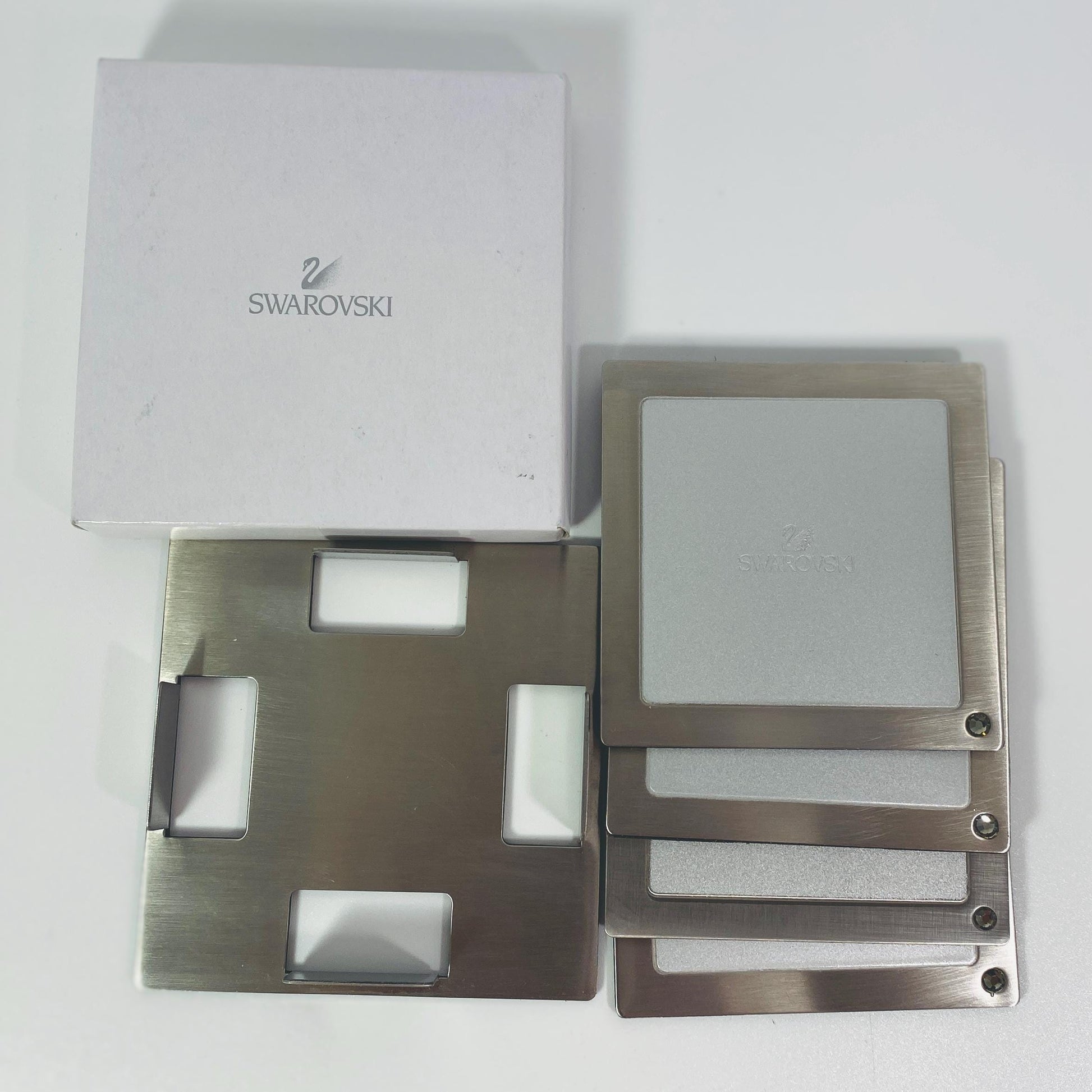 This is a set of four square by Swarovski, featuring Swarovski name embossed, with Swarovski crystal. Add a touch of elegance to any dining or entertaining space. The metallic finish adds a modern and stylish look, while the Swarovski crystal provide a touch of luxury and sophistication to the set. Perfect for protecting surfaces from drink condensation in a glamorous way.
