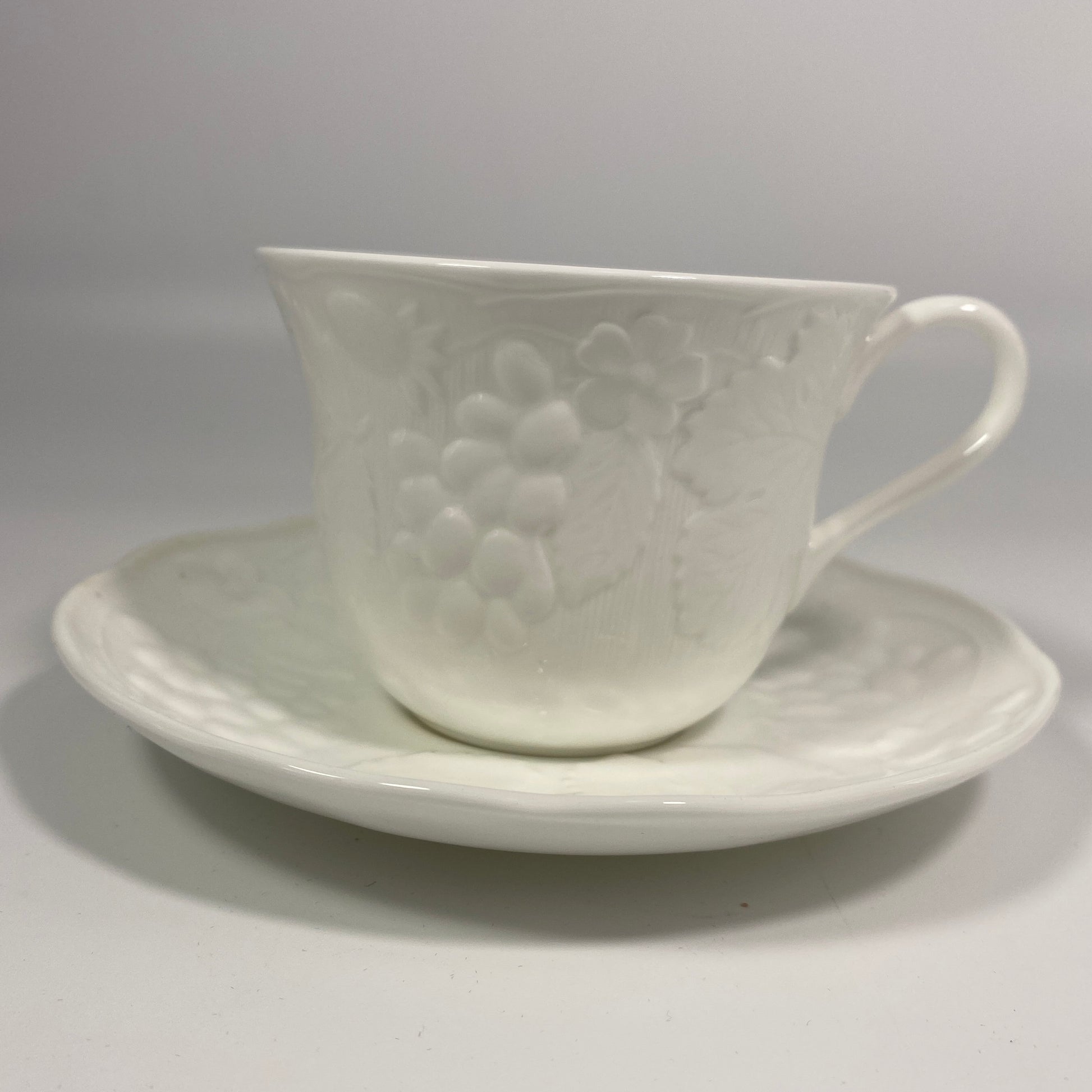 Wedgewood White Bone China Teacup and Saucer Strawberry & Vine Pattern